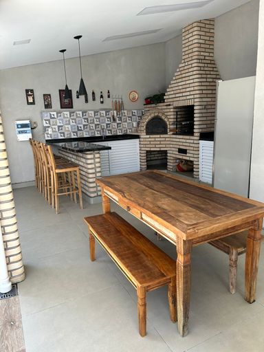 Ambiente ideal para receber familiares e amigos, com mesa de madeira, bancos, geladeira e cooktop.