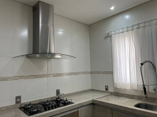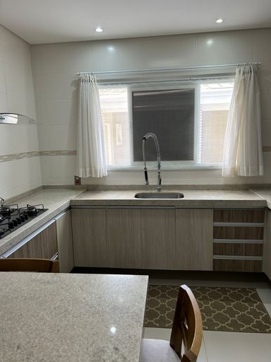 • Cozinha equipada com cooktop, forno elétrico, coifa, cortinas e banquetas